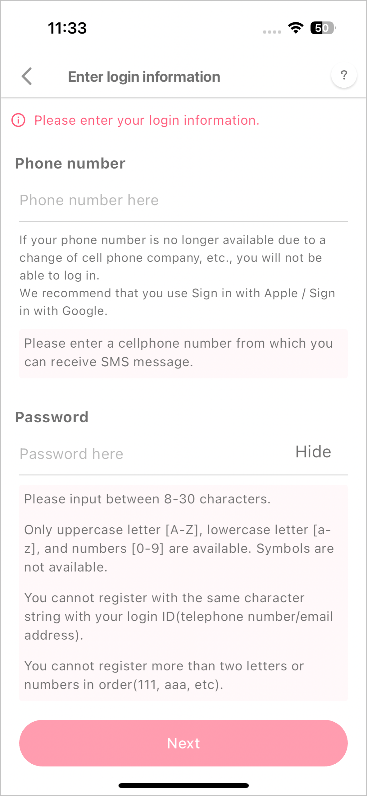1-6. Enter the phone number and password, and proceed to the next step.