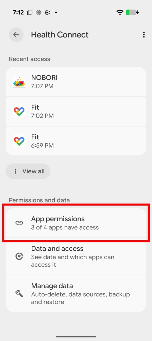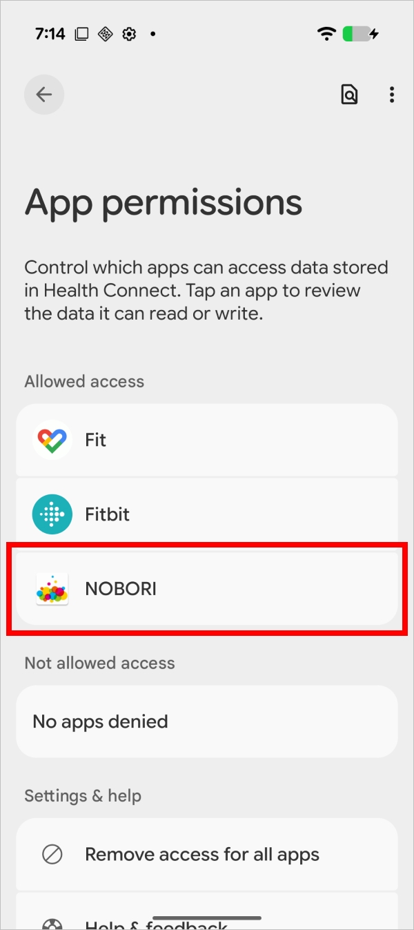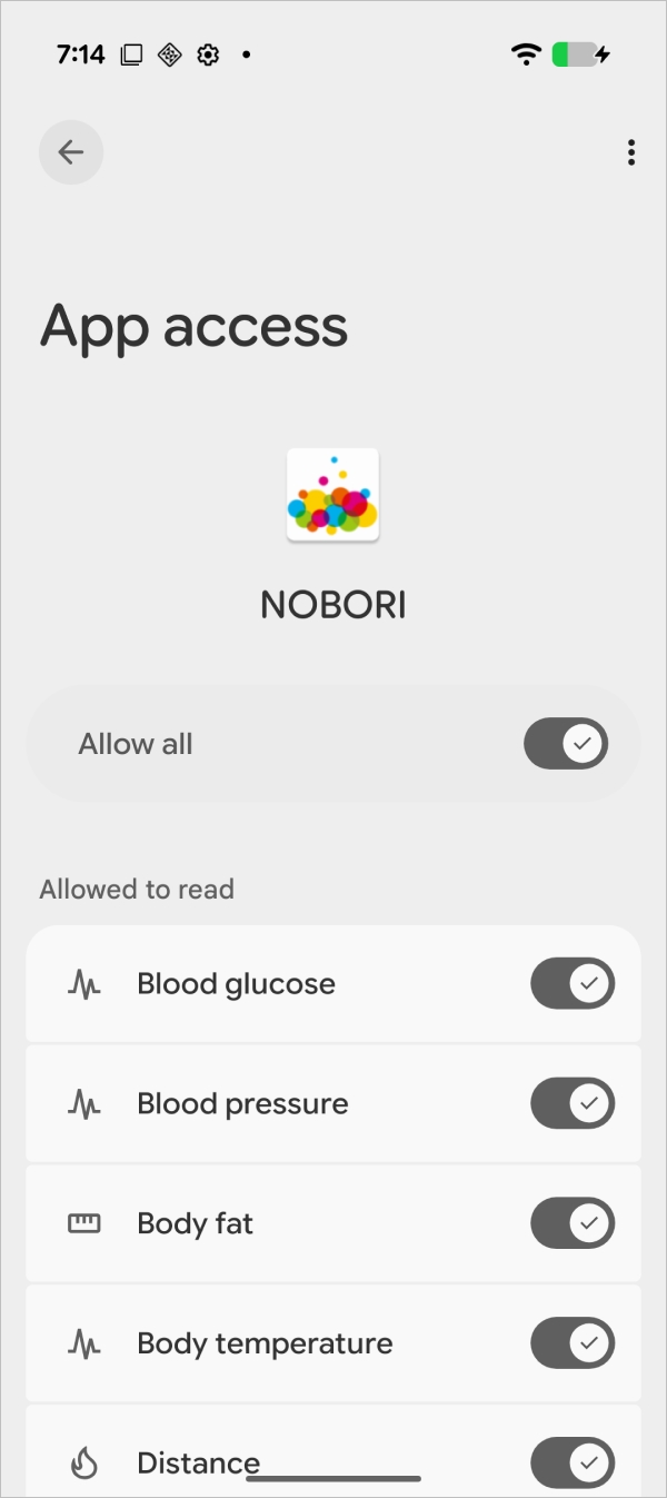 For Android, you can select read permissions for each data category to allow NOBORI to access data from Health Connect.