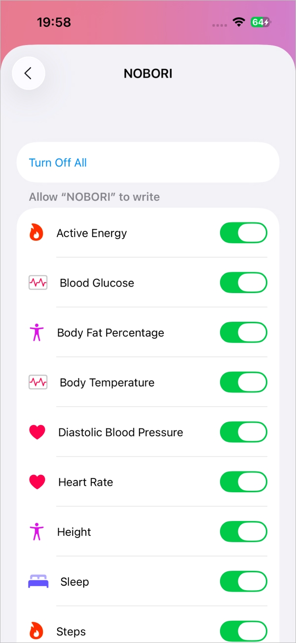 - Allow "NOBORI" to Write Data: Saves data entered in NOBORI to Apple Health.