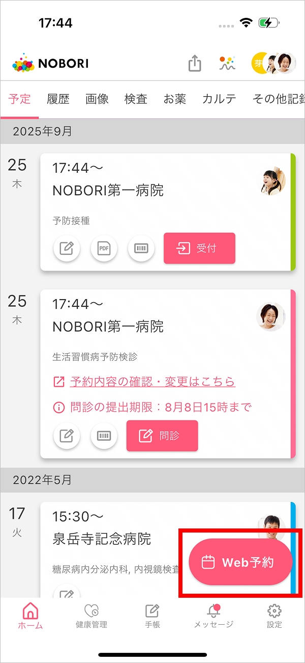 表示された診療予約、または健診予約のボタンをタップすると、Webブラウザに遷移し、Web予約の画面が表示されます。