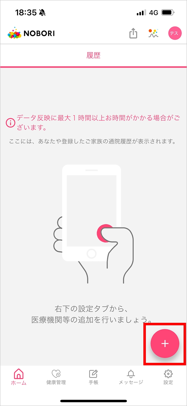 1. ログイン後アプリを起動し、履歴タブにある+ボタンをタップ