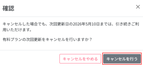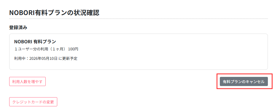 HOMEプランについてPC版で有料プランを解約したい UPDATE 2026.04.15 このページを印刷する PC版で有料プランを解約する方法 ログイン後に設定から、お支払い方法の設定をすることができます。 手順は以下の通りとなります。 1. 右上の「利用中プラン:有料プラン利用中」をクリック 2. 「有料プラン利用中」をクリック 3. 「有料プランのキャンセル」をクリック 4. 「キャンセルを行う」をクリック #解約#パソコン#PC PC版で有料プランを解約したい PC版で有料プランを解約する方法 プランの確認 自分のプランの設定を確認する 有料と無料の違い NOBORI有料プランについて 一覧へ戻る よくあるご質問 一覧へ メールが届かない SMSが届かない その他の問い合わせ