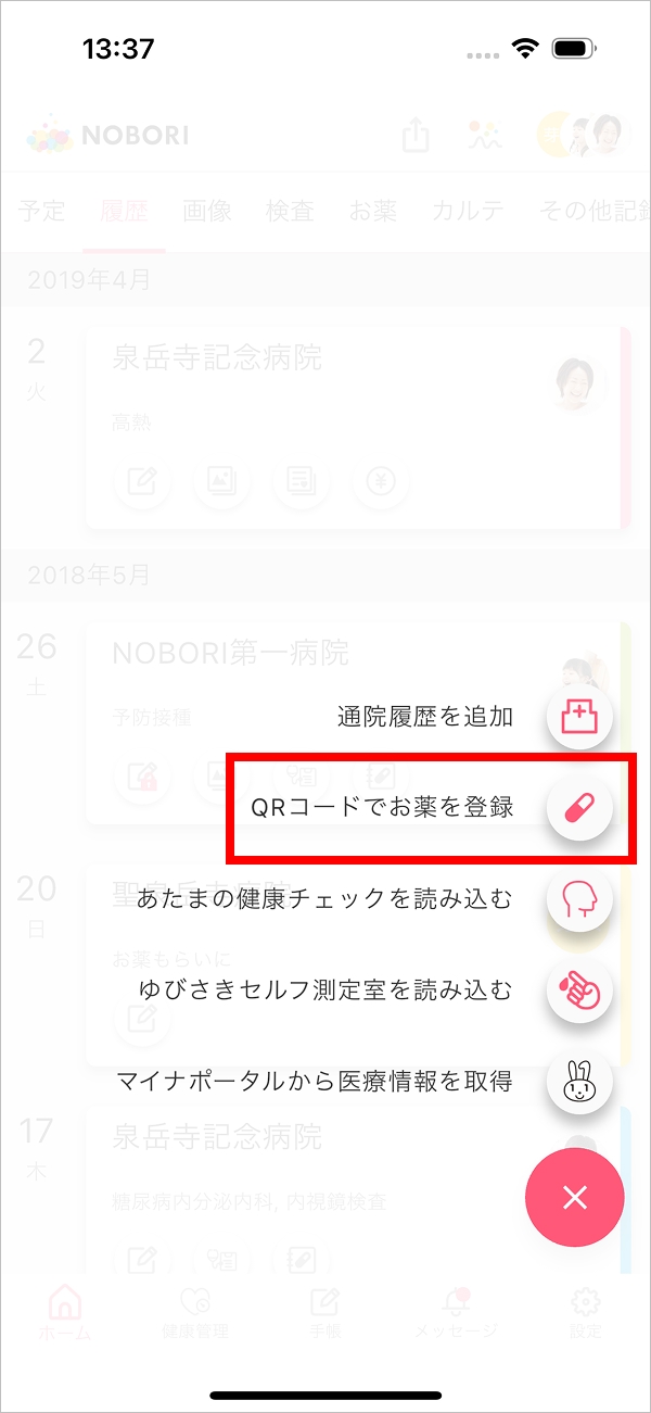 2.「QRコードでお薬を登録」をタップ