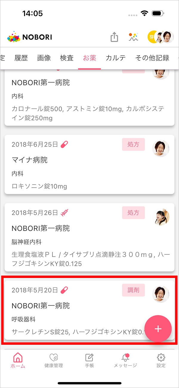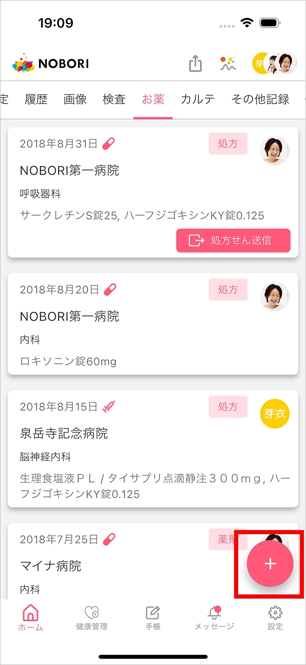 1.履歴タブ、またはお薬タブの右下の+ボタンをタップ