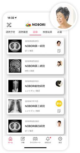 提携医療機関から提供された画像や検査結果、薬などの医療情報をスマートフォンで、いつでも見ることができます。